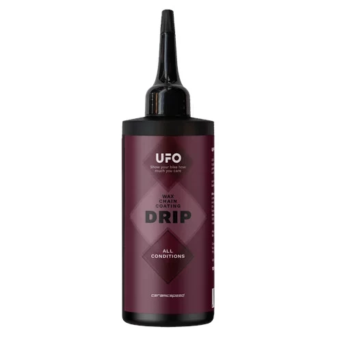 Highly acclaimed by CeramicSpeed, UFO Drip Chain Coating has been updated and is now UFO Drip All Conditions. Now in a new, smaller bottle size and an optimized formula that has a crisp white appearance when applied that virtually disappears when completely dry.
