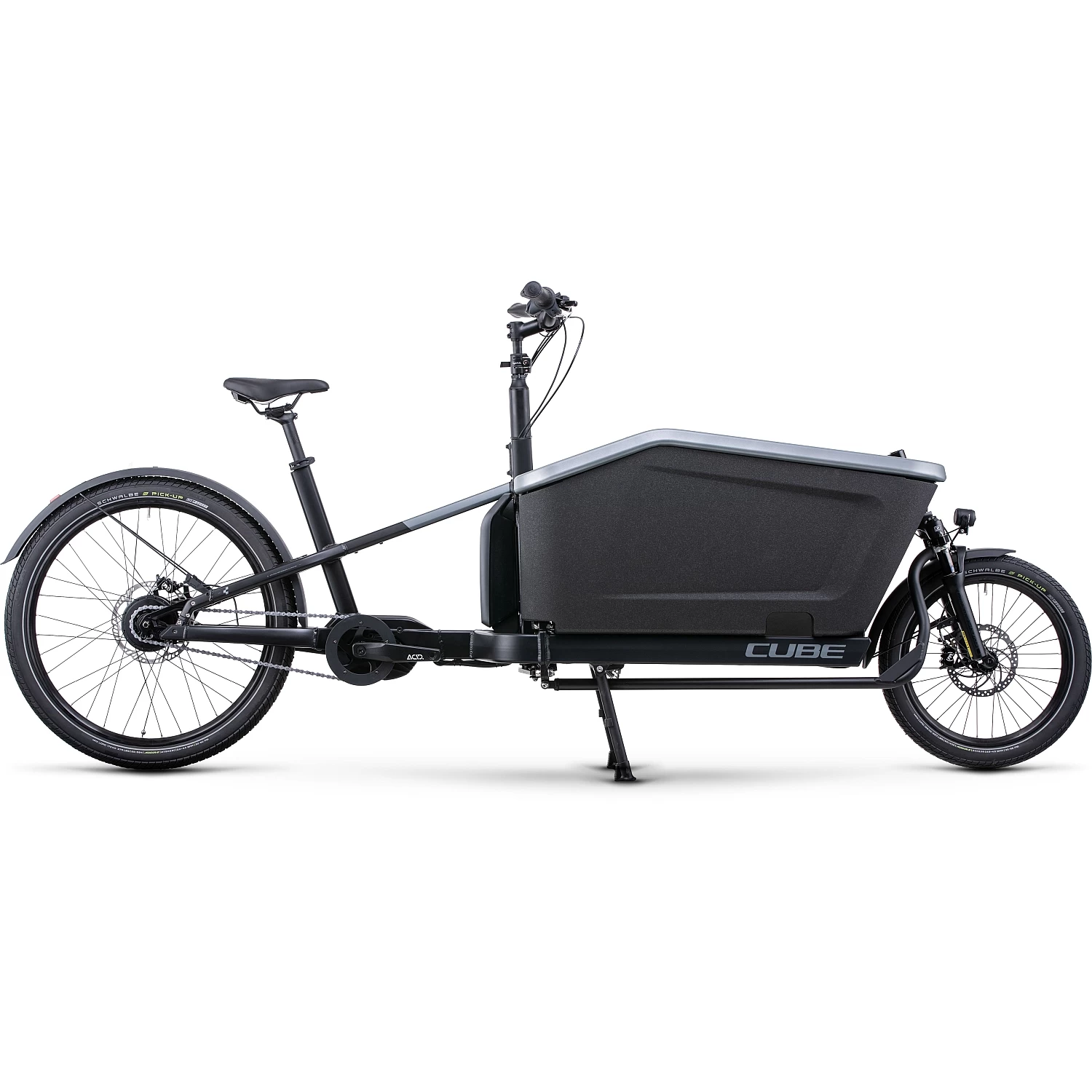 The large transport box brings even bulky belongings safely and easily to their destination – there is an optional rain cover and a double child seat included. Bright LED front and rear lights, grippy Schwalbe tires and powerful hydraulic Magura disc brakes convey safety and reliability, even in adverse weather. An extra dose of comfort and control bring the Suntour suspension fork, mudguards and a side stand.