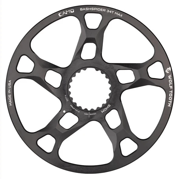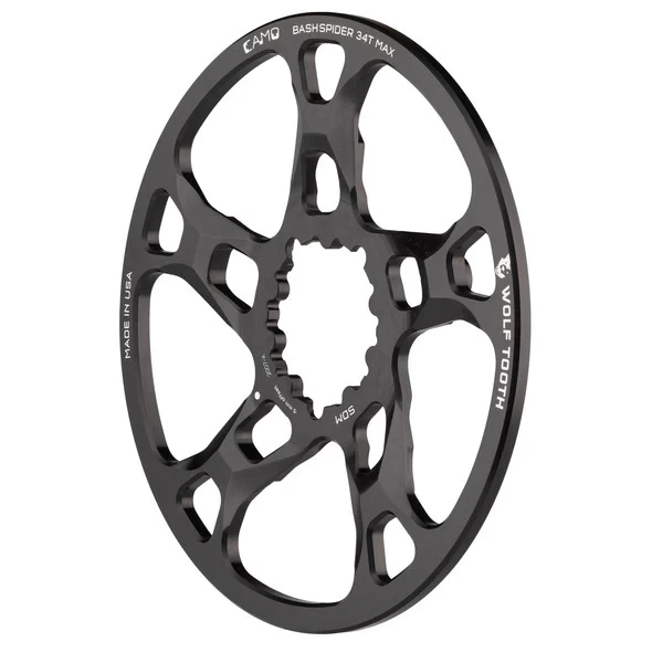 The Wolf Tooth CAMO BashSpider is the world’s only crankset-mounted boost bash ring. This is a spider with an integrated bash ring for use with direct mount cranksets. The CAMO BashSpider pairs with a CAMO chainring to complete the CAMO System.